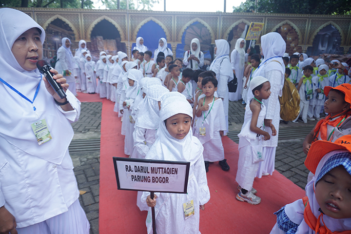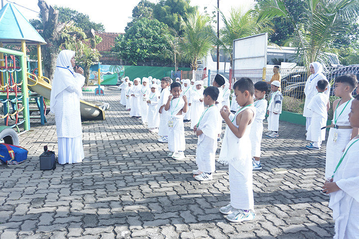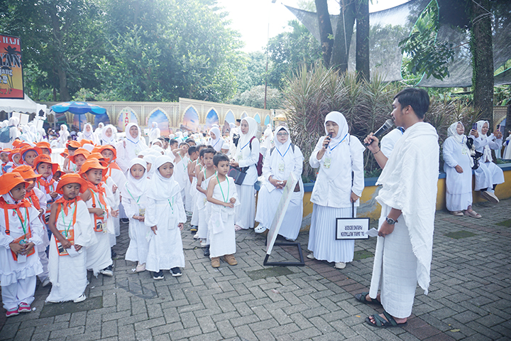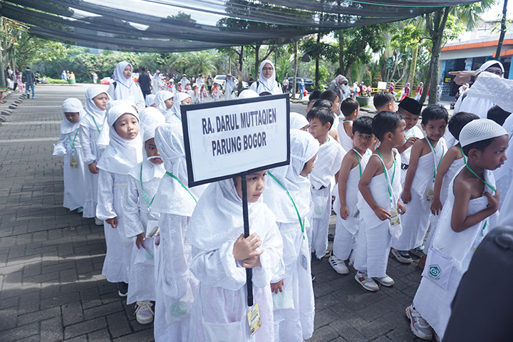 Suasana penuh semangat tampak sejak pagi saat seluruh santri RA Darul Muttaqien Bogor mengikuti upacara untuk melaksanakan kegiatan peragaan praktek manasik haji di The Jungle Bogor, Senin (10/11). Kegiatan ini menjadi momen berharga bagi para santri RA kelompok B untuk belajar secara langsung tata cara pelaksanaan ibadah haji dengan cara yang menyenangkan.