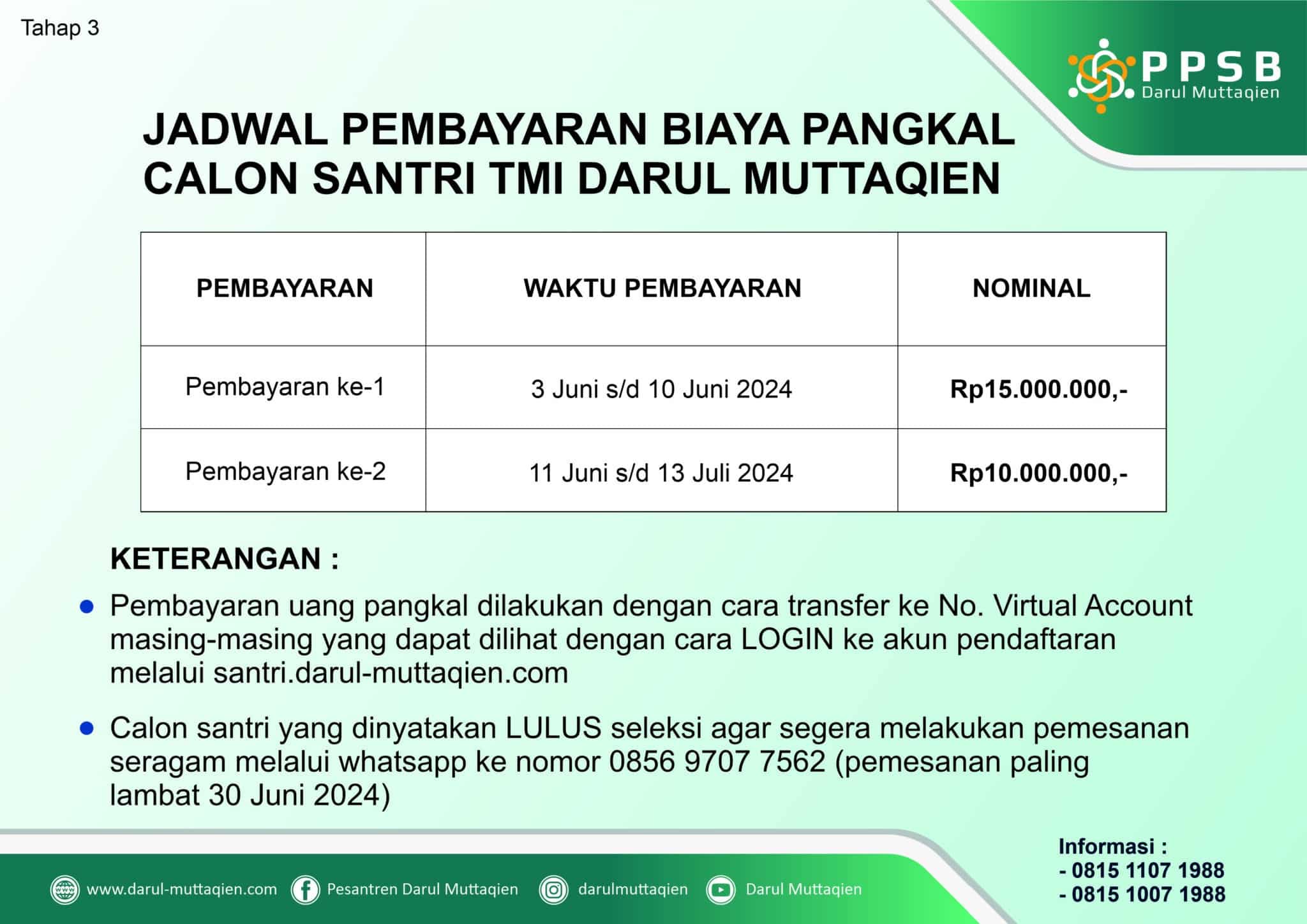 • Pembayaran uang pangkal dilakukan dengan cara transfer ke No. Virtual Account masing-masing yang dapat dilihat dengan cara LOGIN ke akun pendaftaran melalui santri.darul-muttaqien.com