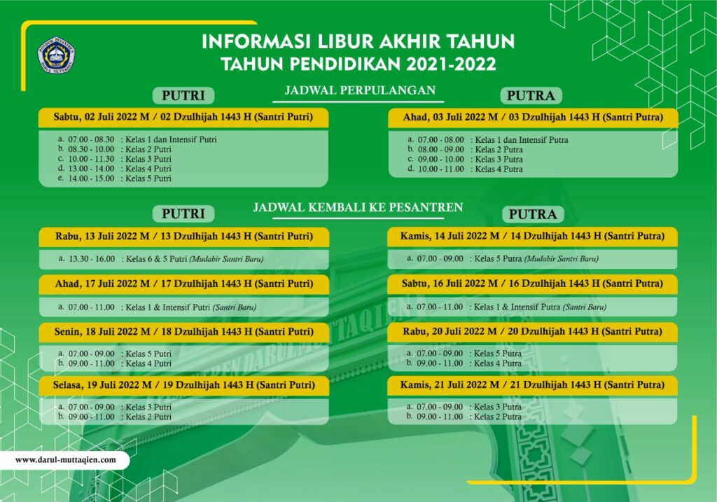 Terkait dengan Libur Santri Semester 2 Tahun Pendidikan 2021-2022, dengan ini Pengasuhan Santri menyampaikan Teknis (Libur) Perpulangan dan Kedatangan Santri Putra dan Putri.