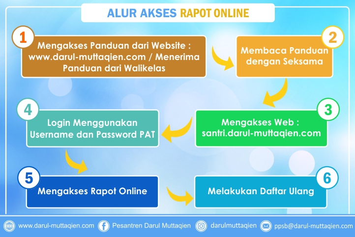 5. Hasil Evaluasi Belajar Semester Genap dalam bentuk rapot TMI sekaligus keputusan kenaikan kelas santri tahun pendidikan 2019-2020 dapat di akses melalui website : www.santri.darul-muttaqien.com mulai hari Sabtu tanggal 4 Juli 2020 dengan persyaratan telah memenuhi kewajiban administrasi pembiayaan bulan Juni 2020.