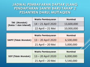 Berdasarkan hasil seleksi masuk santri baru yang telah dilaksanakan pada hari Sabtu, 11 April (untuk SDIT dan SMPIT) dan Ahad, 12 April 2020 (untuk TMI Mondok), berikut ini kami sampaikan jadwal dan ketentuan daftar ulang santri baru tahap 2 :