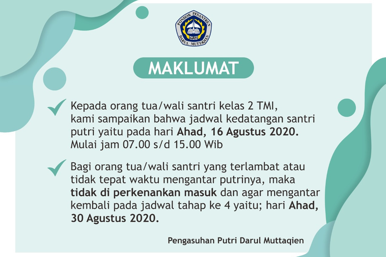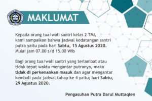 Berikut kami sampaikan jadwal kedatangan santri kelas 2 TMI Darul Muttaqien