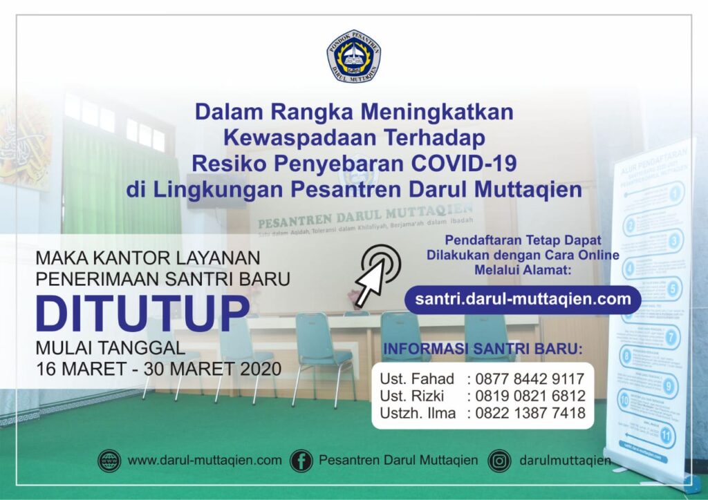 Maka Kantor Layanan Penerimaan Santri Baru DITUTUP Mulai tanggal 16 Maret – 30 Maret 2020.