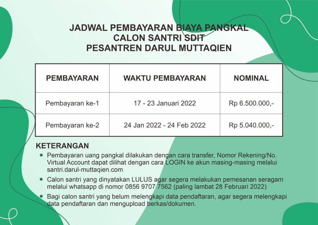 Berdasarkan hasil ujian tahap 1 yang dilaksanakan secara online pada hari Sabtu, 15 Januari 2022 dan hasil rapat kelulusan Penerimaan Santri Baru (PSB) SDIT Darul Muttaqien Tahun Pendidikan 2022-2023, berikut kami sampaikan daftar nama-nama calon santri baru yang dinyatakan LULUS dan diterima di SDIT Darul Muttaqien.