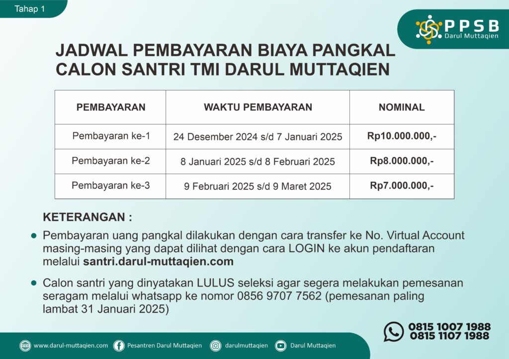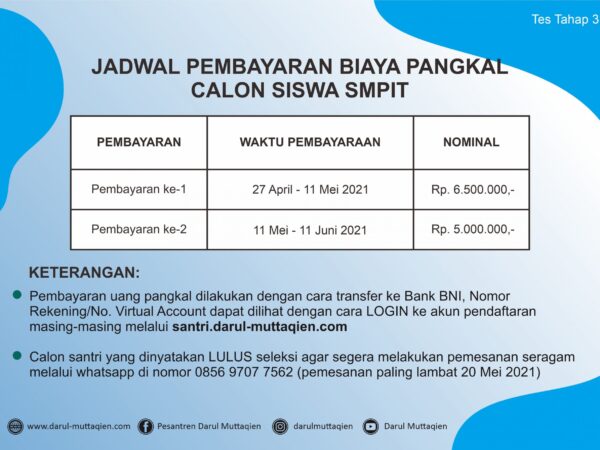 Pengumuman hasil tes calon santri baru dijadwalkan hari ini pada selasa (24/12) dan sudah bisa dilihat oleh orangtua dan calon santri baru TMI melalui website pesantren (www.darul-muttaqien.com) atau bisa juga dilihat pengumumannya dengan login ke akun pendaftaran masing-masing.