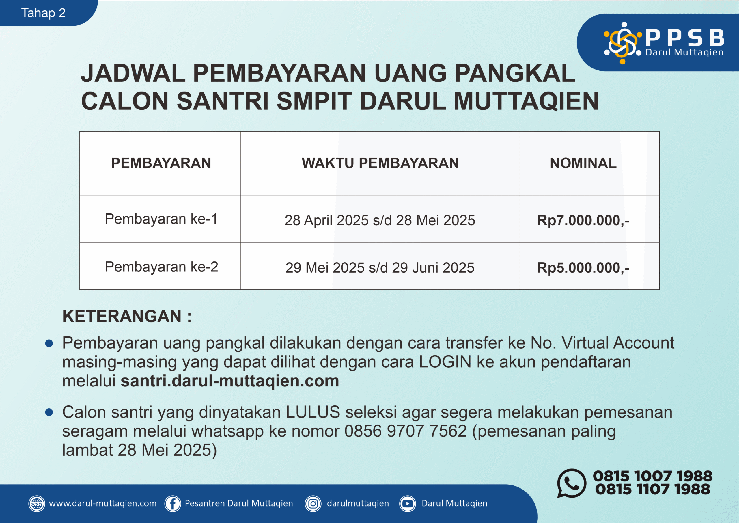 Berdasarkan hasil seleksi yang dilaksanakan pada hari Sabtu, 26 April 2025 dan hasil rapat kelulusan Penerimaan Santri Baru SMPIT Darul Muttaqien Tahun Pendidikan 2024-2025, berikut kami sampaikan daftar nama-nama calon santri baru yang dinyatakan LULUS dan diterima di SMPIT Darul Muttaqien.