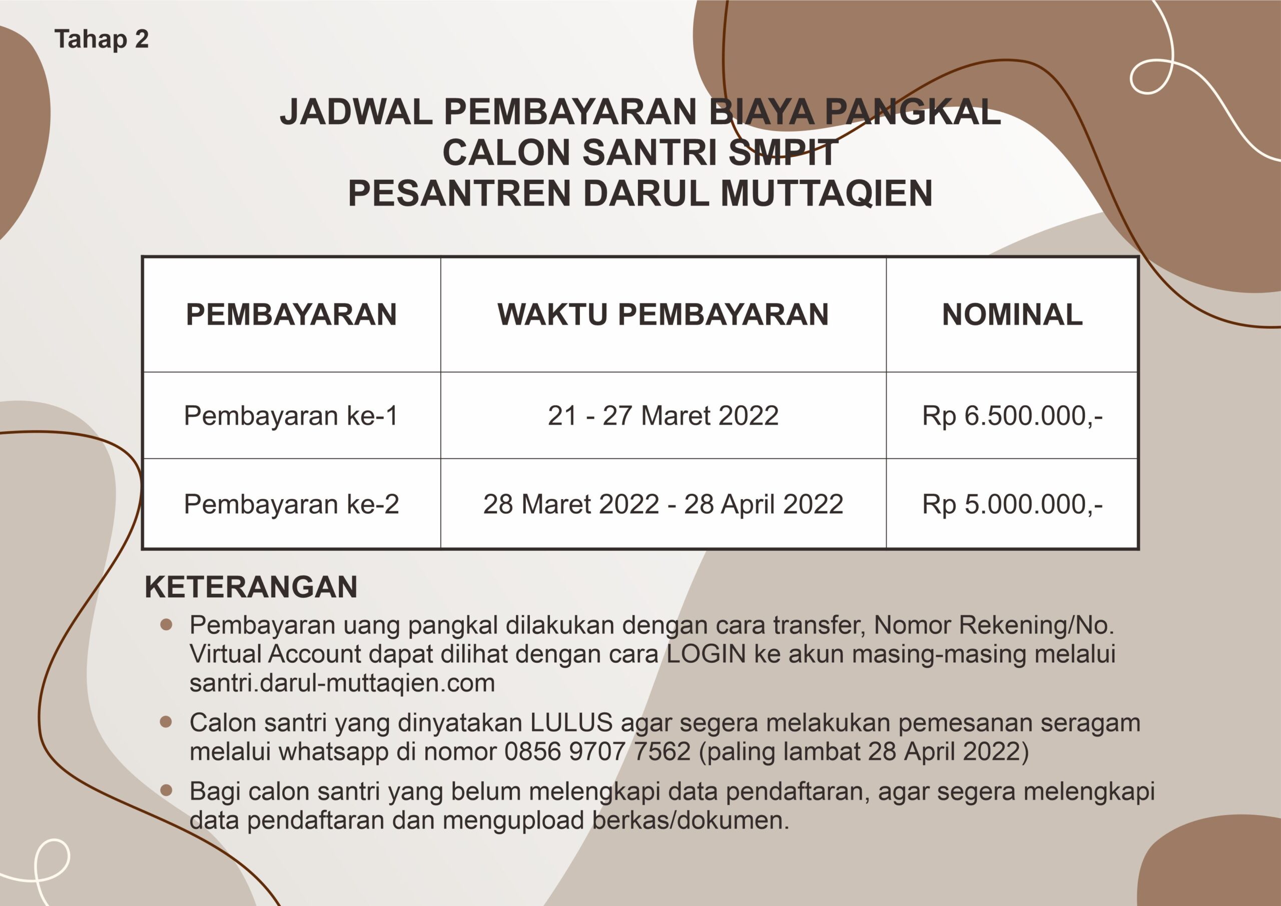 • Pembayaran uang pangkal dilakukan dengan cara transfer, Nomor Rekening/No. Virtual Account dapat dilihat dengan cara LOGIN ke akun masing-masing melalui santri.darul-muttaqien.com