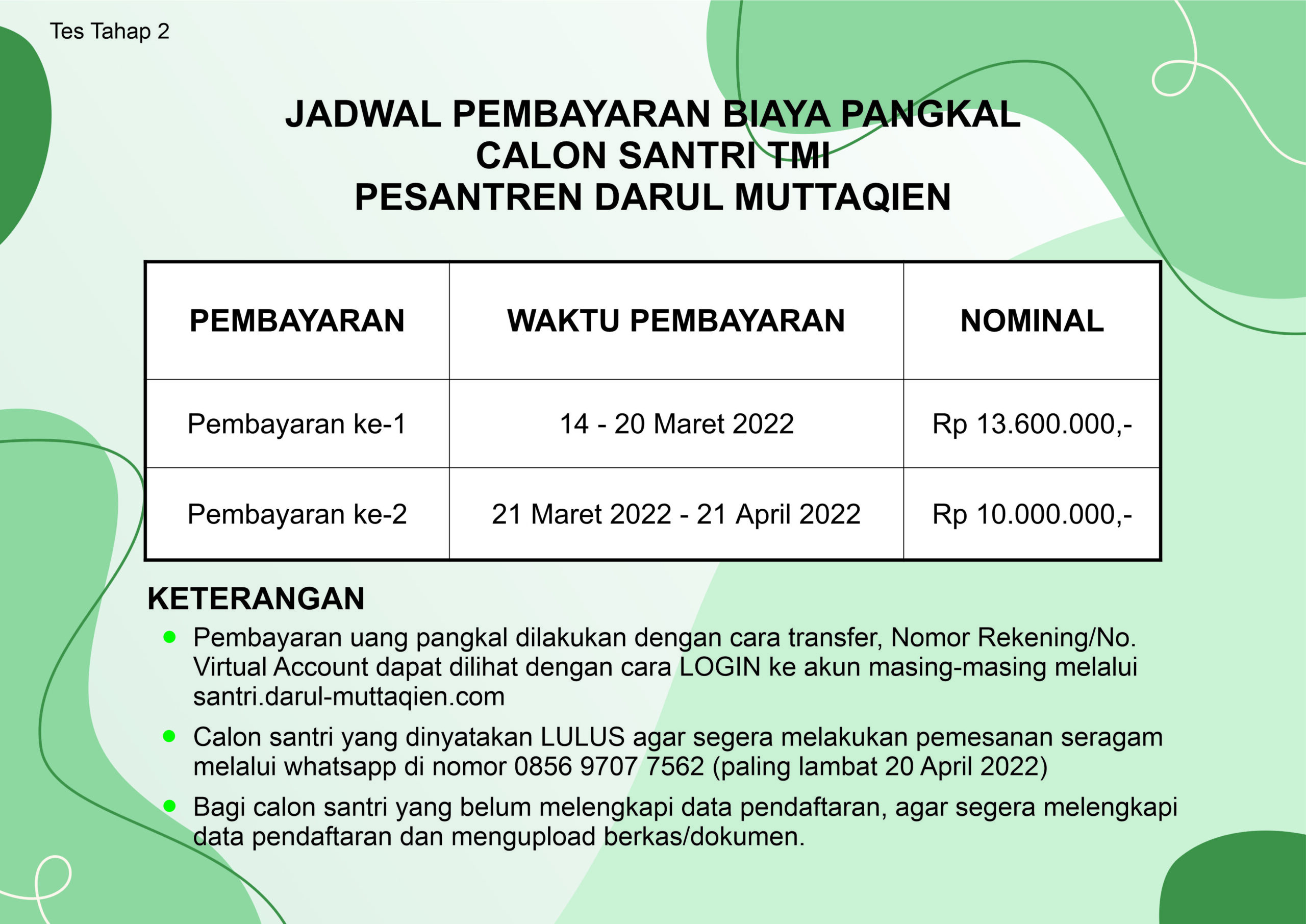 • Calon santri yang dinyatakan LULUS seleksi agar segera melakukan pembayaran uang pangkal dan memesan seragam.