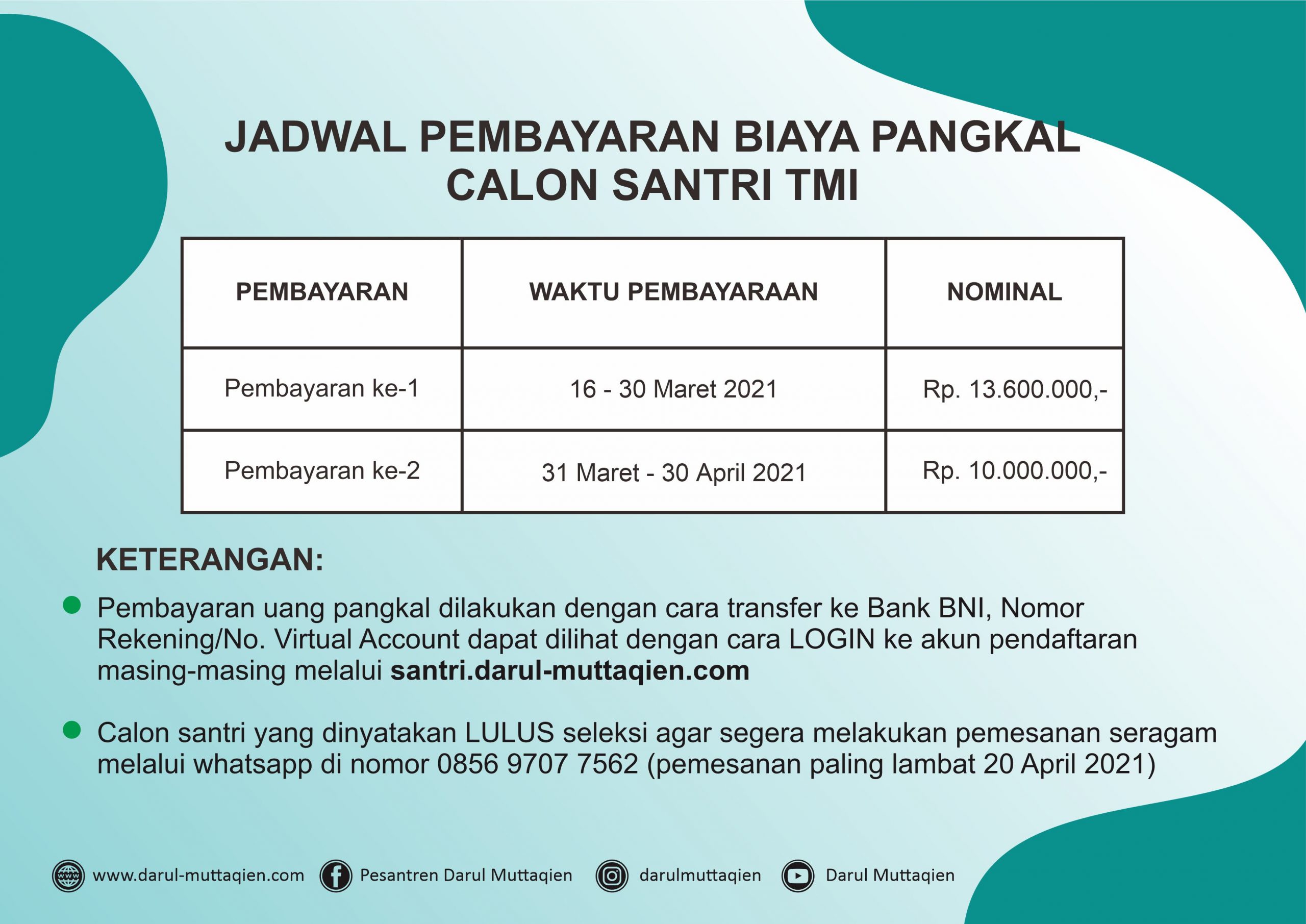 Berdasarkan hasil seleksi yang dilaksanakan secara online pada hari Ahad, 14 Maret 2021 dan hasil rapat kelulusan Penerimaan Santri Baru (PSB) TMI Darul Muttaqien Tahun Pendidikan 2021-2022, berikut kami sampaikan daftar nama-nama calon santri baru yang dinyatakan LULUS dan diterima di TMI Darul Muttaqien.