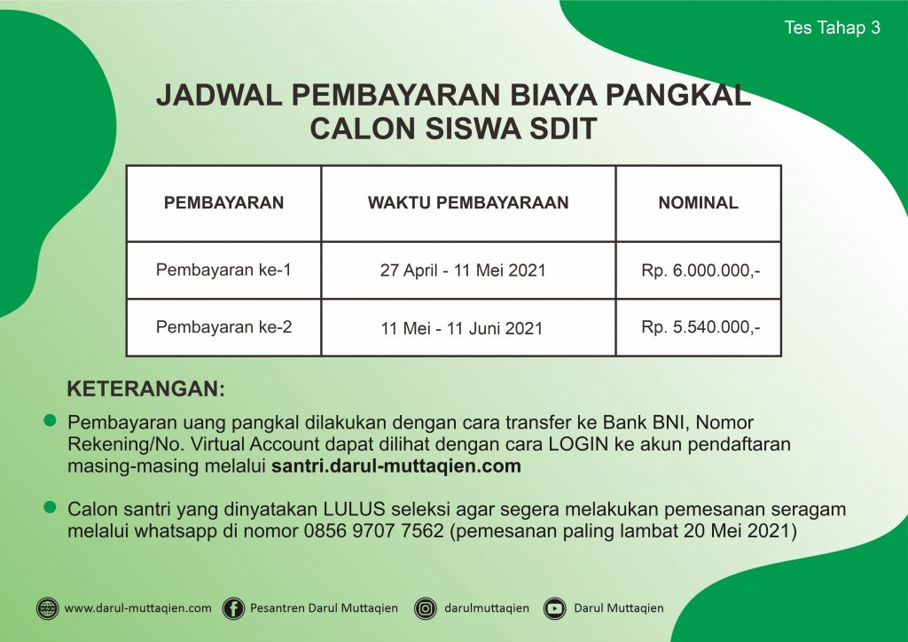 Berdasarkan hasil seleksi yang dilaksanakan secara online pada hari Ahad, 25 April 2021 dan hasil rapat kelulusan Penerimaan Santri Baru (PSB) SDIT Darul Muttaqien Tahun Pendidikan 2021-2022, berikut kami sampaikan daftar nama-nama calon santri baru yang dinyatakan LULUS dan diterima di SDIT Darul Muttaqien.