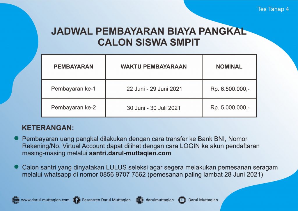 Berdasarkan hasil seleksi yang dilaksanakan secara online pada hari Ahad, 20 Juni 2021 dan hasil rapat kelulusan Penerimaan Santri Baru (PSB) SMPIT Darul Muttaqien Tahun Pendidikan 2021-2022, berikut kami sampaikan daftar nama-nama calon santri baru yang dinyatakan LULUS dan diterima di SMPIT Darul Muttaqien.
