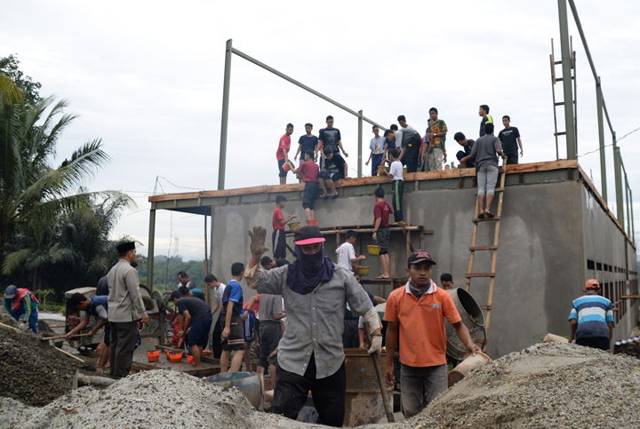 Senin (17/2), seluruh santri kelas 3 dan 6 TMI putra bergotong royong dalam pengecoran gedung kelas putri, seluruhnya tampak kompak berbaris secara estafet untuk meng-oper ember yang berisi adukan semen, pasir dan batu kerikil.
