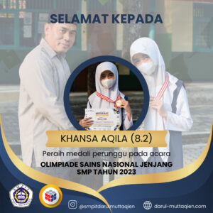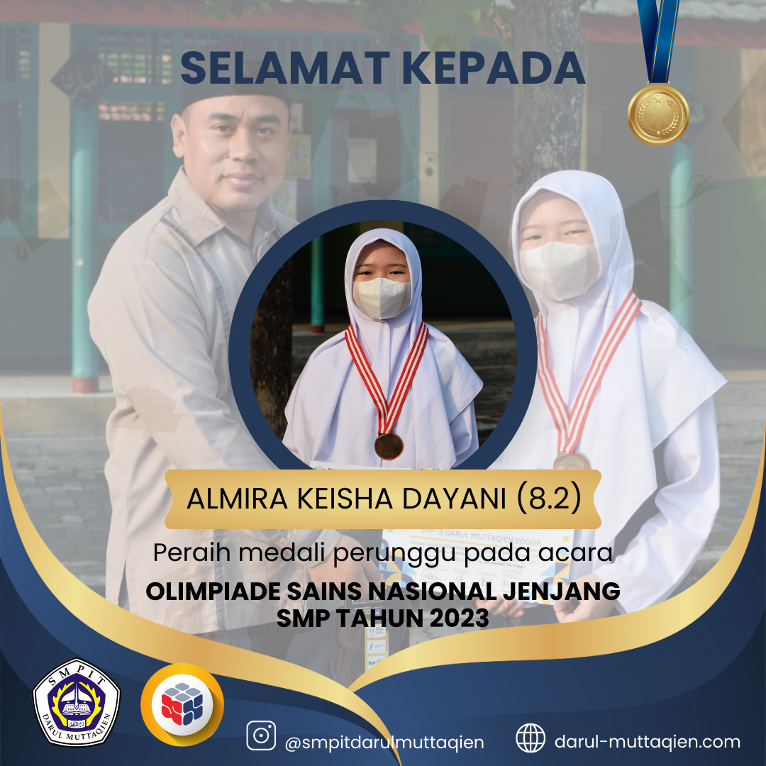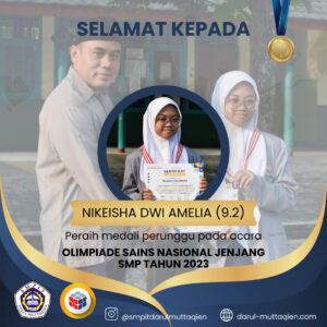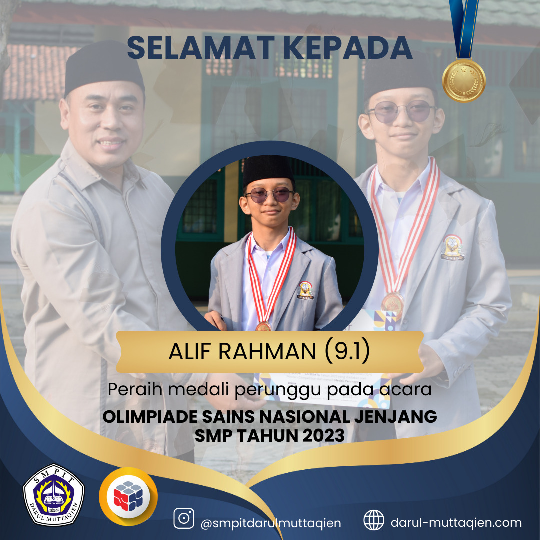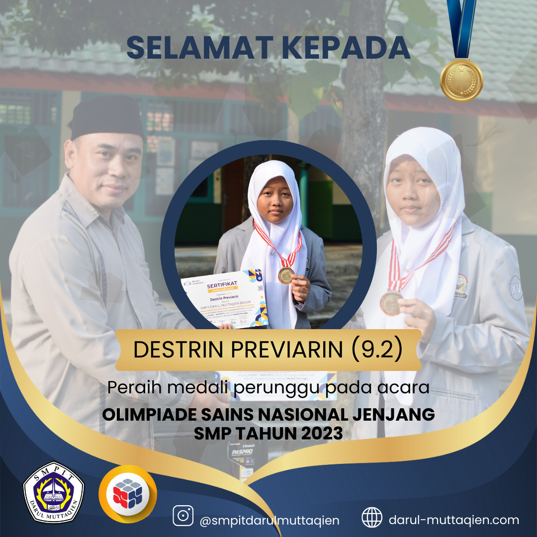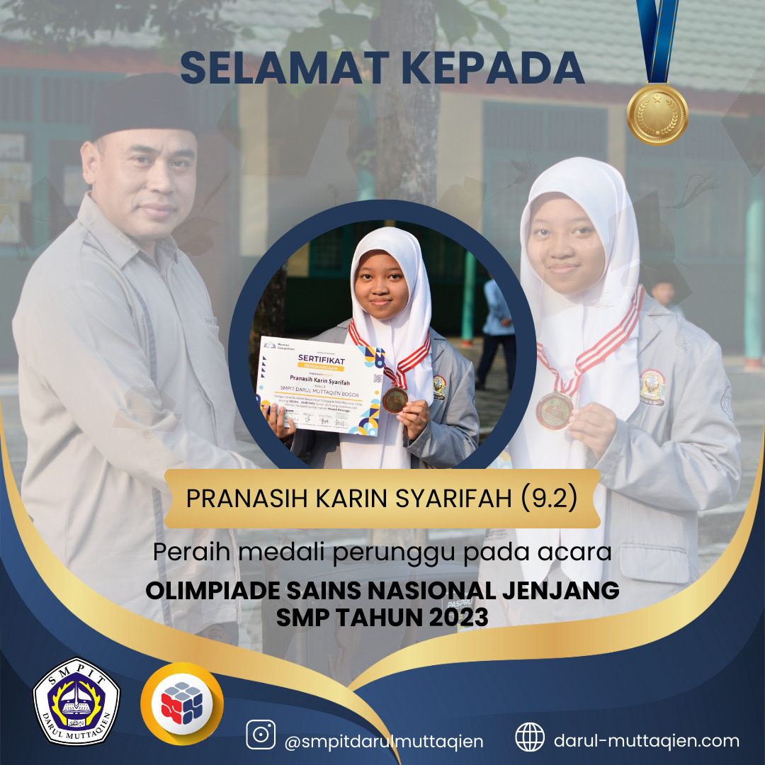 SMPIT Darul Muttaqien meraih prestasi membanggakan dalam Olimpiade Sains Nasional tingkat SMP tahun 2023. Kontingen SMPIT Darul Muttaqien berhasil menyumbangkan medali perunggu dalam ajang bergengsi tersebut. Olimpiade Sains Nasional merupakan ajang kompetisi tingkat nasional yang melibatkan peserta dari berbagai sekolah di seluruh Indonesia.